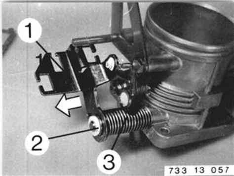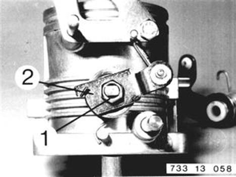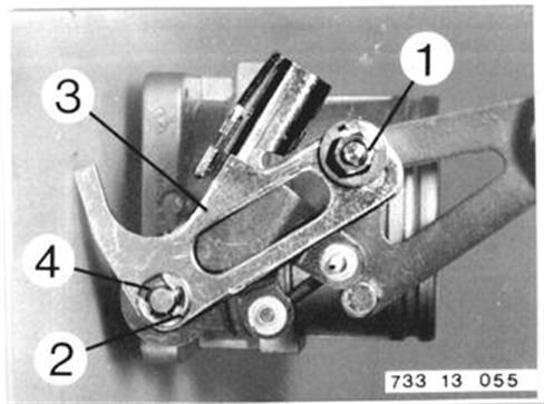 Vehicles after change point in 1982 REMOVING AND INSTALLING RETURN SPRINGS OF THROTTLE SHAFT Remove throttle housing 13 54 030. Unscrew nut (1). Lift out retainer (2). Remove connecting plate (3). Important! Washers (4) on both sides of connecting plate. 13 54 030