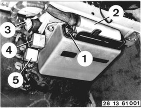 Push back lock (1) and pull out multiple pin plug (2). Installation: Plug (3) must be connected. Check for correct connection of plugs (polarity). Relay (4) = fuel pump relay Relay (5) = master relay | ![]() |