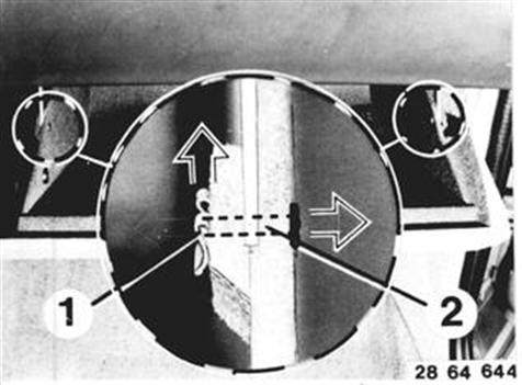 Vehicles after change point in 1982 REMOVING AND INSTALLING CONTROL UNIT Open the glove box. Lift out retainer (1). Pull off pin (2) of both retaining straps. | ![]() |