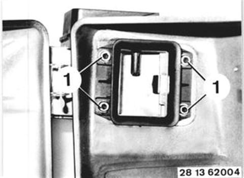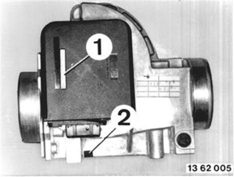 Unscrew screws (1) and take off the air flow sensor. Check gasket between air cleaner housing and air flow sensor, replacing if necessary. Installation: Install screws with a liquid bolt cement, HWB No. 81 22 9 400 086. | ![]() |