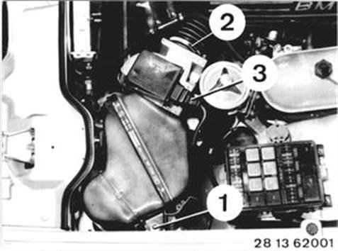 Vehicles after change point in 1982 REMOVING AND INSTALLING AIR FLOW SENSOR Unscrew nut (1). Loosen hose clamp (2). Pull off plug (3). Take off air cleaner with air flow sensor. | ![]() |