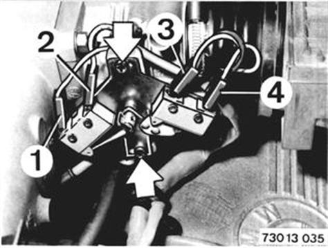 Version with Two Microswitches: Pull off wires (1 ... 4) and unscrew both bolts. Installation: Don´t mix up wires from idle switch with those from full throttle switch. Adjust throttle switch 13 63 544. 13 63 544