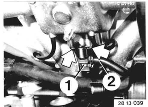 CHECKING/REPLACING COLD START VALVE The cold start valve will enrich the fuel/air mixture for starts when coolant temperature is below 15/35°C (59/95°F). Pull off plugs on cold start valve. Remove cold start valve. Fuel line remains connected. Check that fuel pump functions correctly (see "Checking Fuel Pump Pressue"). | ![]() |