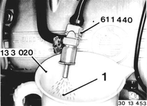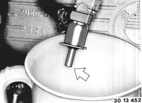 Hold cold start valve in measuring glass 13 3 020. Connect Jetronic test lead no. 61 1 440 on cold start valve and on B+/ground. Cold start valve should eject fuel. Installation: Check O-ring, replacing if necessary. | ![]() |