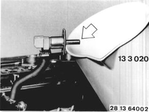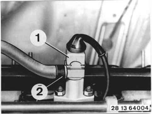 Vehicles after change point in 1982 REMOVING AND INSTALLING COLD START VALVE Note: Some of the models no longer have a cold start valve. Removing and Installing: Pull off plug (1). Unscrew fuel hose (2). Unscrew bolts. Take off cold start valve. | ![]() |