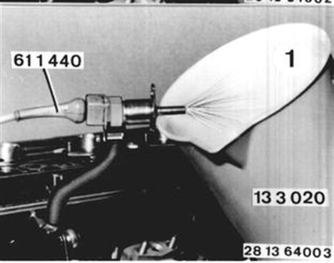 Checking Fuel Flow Rate and Spray Angle: Hold the cold start valve in a measuring cup, Special Tool 13 3 020. Plug Jetronic test leads 61 1 440 on the cold start valve on connect with B+ and B-. Check the fuel flow rate* and spray angle (1)*. * See Specifications