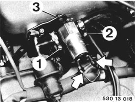 REPLACING AUXILIARY AIR VALVE The auxiliary air valve will prevent an excessive drop in engine speed, if while idling the air conditioner is turned on or is on. Check the following, if engine stalls when turning on air conditioner while engine is running at idle speed. With air conditioner on (heater switch at "cold"), black wire must have voltage and air must flow through auxiliary air valve. There must not be air flowing through with air conditioner off. Brown wire = ground. Pull off wires. Loosen hose clamps (1 and 2). Unscrew nut (3) and remove auxiliary air valve.
