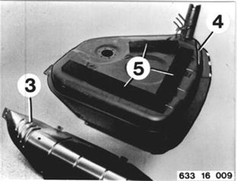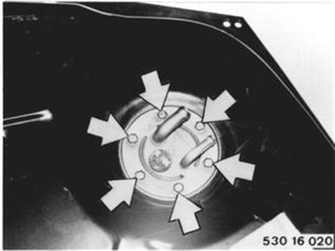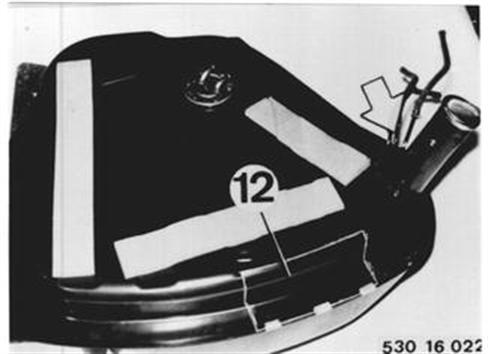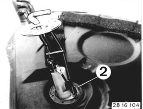 Vehicles after change point in 1982 REPLACING FUEL TANK Remove and install fuel tank 16 11 030. Unscrew nuts and pull out fuel level transmitter. Installation: Replace seal (1). 16 11 030