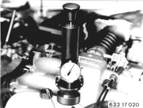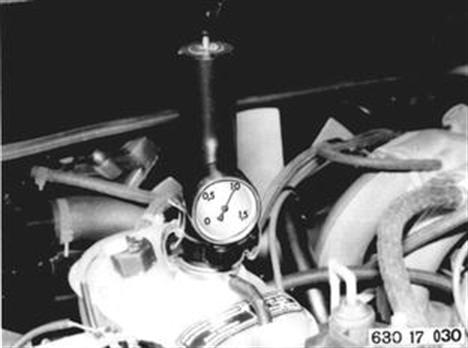 Vehicles after change point in 1982 CHECKING COOLING SYSTEM FOR LEAKS Applay Special Tool 17 0 002 (with adapter 17 0 003 for screw-on cap) and produce 1 bar (14 psi) pressure. Cooling system does not leak, if there is no considerable prssure drop (approx. 0.1 bar or 0.7 psi) after waiting about 2 minutes. | ![]() |