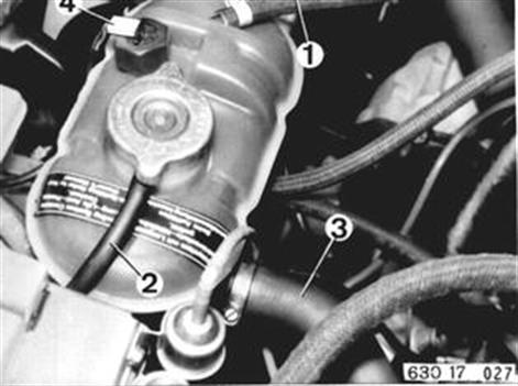REMOVING AND INSTALLING RADIATOR EXPANSION TANK Drain some of coolant. Detach hose (1) and overflow hose (2) as well as elbow (3) at expansion tank. Disconnect wire at level switch (4). Installation: Fill and bleed cooling system 17 00 039. 17 00 039