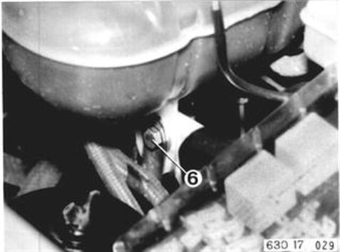 Disconnect hoses (3 and 4). Pull off plug (5). Remove bolt (6) and take off expansion tank. | ![]() |