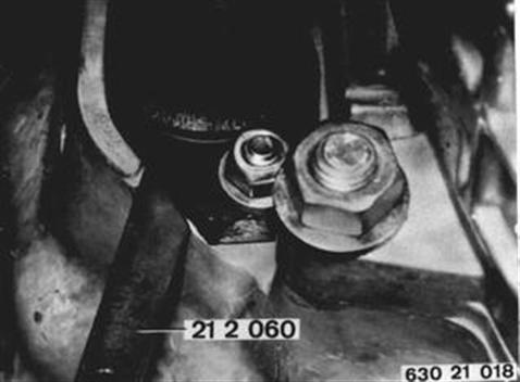 Remove clutch housing 21 11 000. Check out-of-true at ends of diaphragm springs¹). Hold flywheel with Special Tool 11 2 160. Loosen mounting bolts one after the other by 1 to 1 and 1/2 turns until clutch is without tension. Remove mounting bolts, clutch and drive plate. Important: Don´t throw or drop clutch. Improper handling could cause the tangential leaf springs holding clutch in axial direction to be bent off. The diaphragm springs would have the stroke, but because of the lame leaf springs the pressure ring would not lift high enough to release the drive plate. 21 11 000 ¹) See Specifications