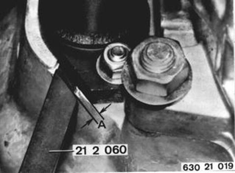 With a gap (A) of 5 mm (0.197") between gauge 21 2 060 and the slave cylinder, the drive plate is worn and must be replaced. | ![]() |