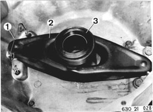 Vehicles after change point in 1982 REMOVING AND INSTALLING/ REPLACING CLUTCH RELEASE Remove clutch housing 21 11 000. Remove spring (1) and release lever (2) with release (3). 21 11 000