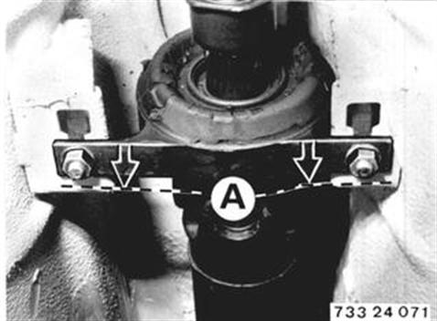 Unscrew center mount: Installation: Preload center mount forward by distance A = 2 to 4 mm (0.079 to 0.157´´). Tightening torque*. Bend propeller shaft down and pull off of centering pin. Important! Suspend propeller shaft from car on piece of wire. * See Specifications