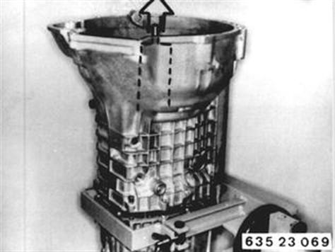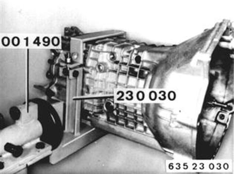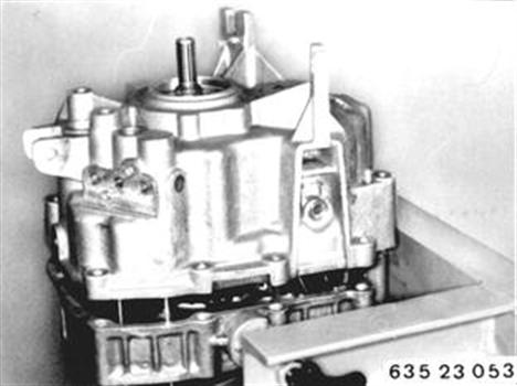 Vehicles after change point in 1982 REMOVING AND INSTALLING/SEALING FRONT AND REAR TRANSMISSION CASE SECTIONS Remove transmission - see 23 00 022. Mount Special Tool 23 0 030 on Special Tool 00 1 490. Unscrew filler bolt. Drain oil. Mount transmission on special tool plate. Important! Check grade of oil and volume of oil*. 23 00 022 * See Specifications