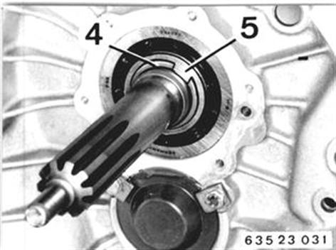 Remove guide sleeve - see 23 11 622. Lift out snap ring (4). Take off washer (5). Installation: Always replace the snap ring. 23 11 622