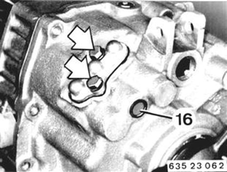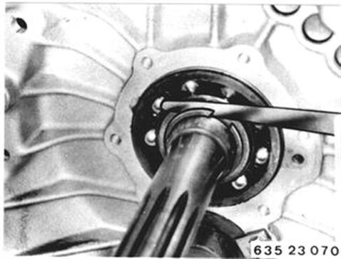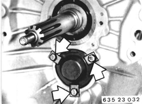Engage 4th gear. Unscrew bolt (9) while holding the output flange with Special Tool 23 0 020. Take off washer (10). Installation: Install bolt (9) with a bolt cement. | ![]() |