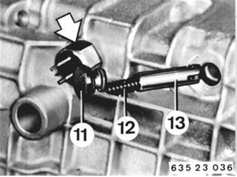 Unscrew backup light switch. Lift out cover (11). Pull out spring (12) and lockpin (13). Check installed position. | ![]() |