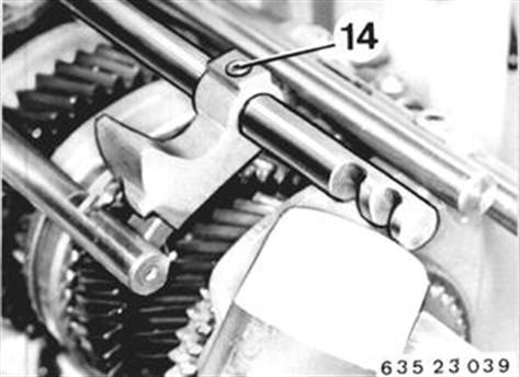 Fourth gear is engaged. Drive pin (14) out of selector shaft while counterholding. | ![]() |