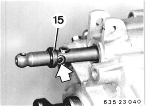 Drive out selector shaft toward the rear. Radial oil seal (15) will also be pulled out. Important! Grooves on selector shaft. Take off selector arm. Installation: Replace radial oil seal. | ![]() |
