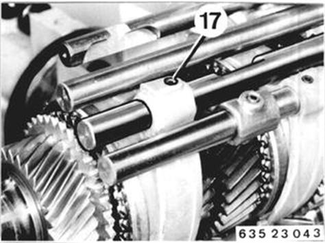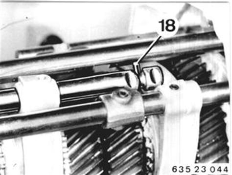 Take out 4th gear. Drive pin (18) out of 3rd/4th gear selector rod while counterholding. | ![]() |