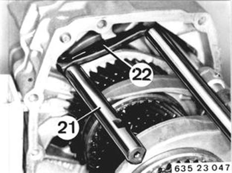 Pull out selector rail (21) forward. Take off operating lever (22). Installation: Mark on operating lever faces up. | ![]() |