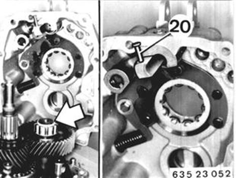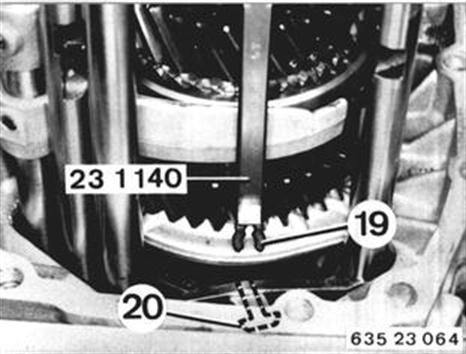 Position drive shaft vertically. Slide bearing shaft (20) in direction of the gear wheel set. Install retainer (19) with Special Tool 23 1 310. | ![]() |