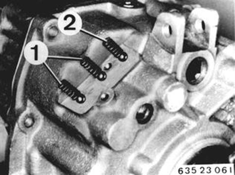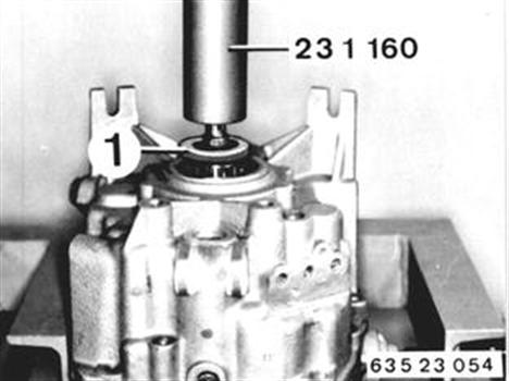 Heat bearing inner race (1) to about 80°C (175°F) with a hot air blower and slide it onto the output shaft, pressing on with Special Tool 23 1 160 if necessary. | ![]() |