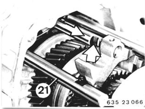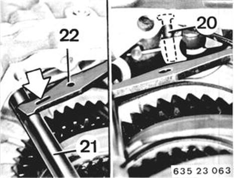 Insert selector arm. Slide in the selector shaft. Important! The opening in the selector shaft faces selector rail (21). | ![]() |
