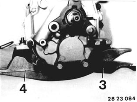 Vehicles after change point in 1982 REMOVING AN INSTALLING/SEALING TRANSMISSION CASE FRONT SECTION Remove transmission 23 00 022. Unscrew exhaust bracket (3) and cross member (4) with rubber mounts. 23 00 022