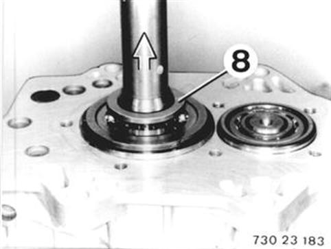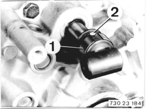 Remove guide flange 23 11 622. Lift out circlip (1). Take off grooved washer (2). Installation: Position grooved washer that groove faces the circlip. 23 11 622