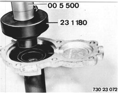 Drive in radial oil seal against stop with Special Tool 23 1 180 used in conjunction with Special Tool 00 5 500. Open end faces transmission. Lubricate sealing lip with oil. | ![]() |