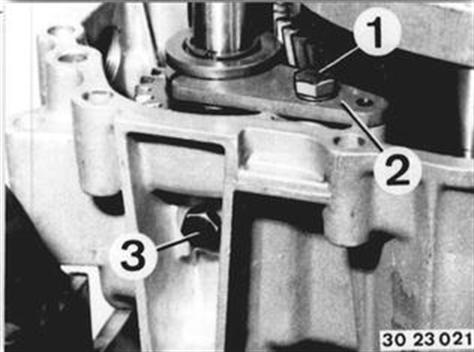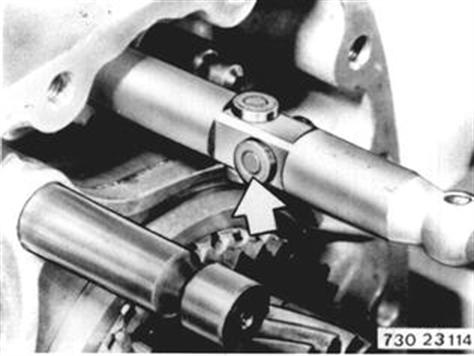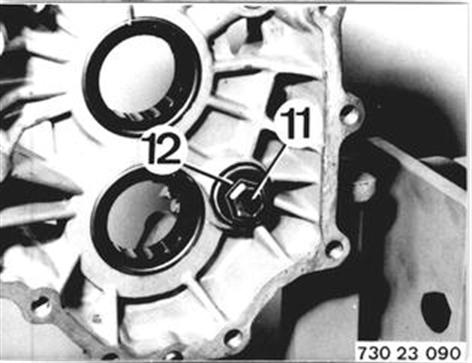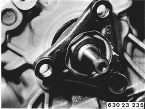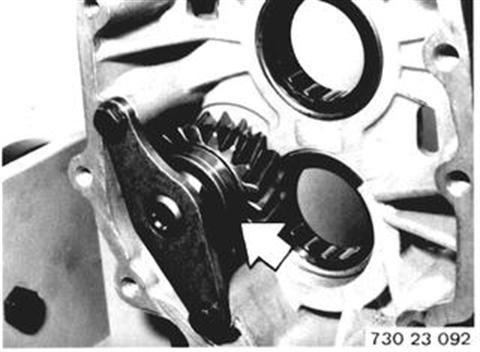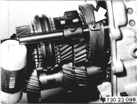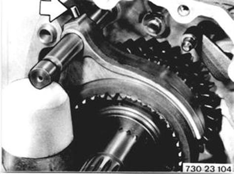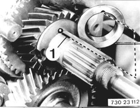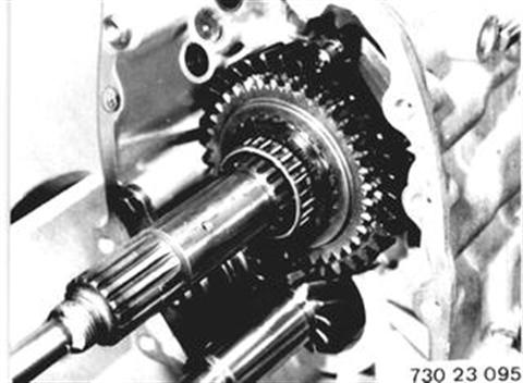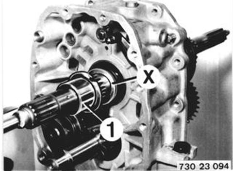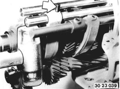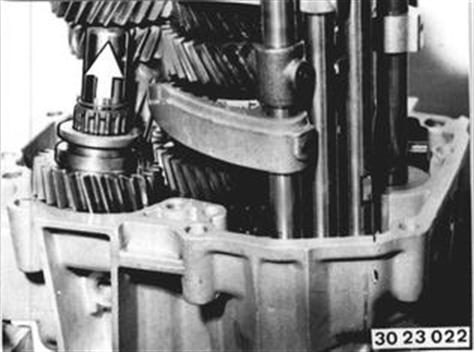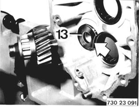 Knock out reverse gear shaft. Installation: Watch installed position of thrust washer (13). Check needle bearing, replacing if necessary. Check whether all bearings can be reused, replacing if necessary (see 23 21 703). 23 21 703