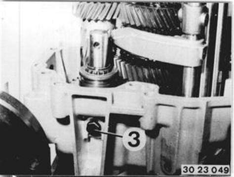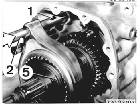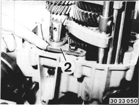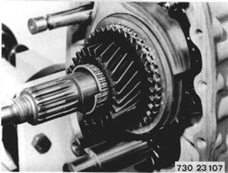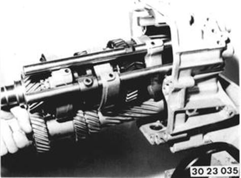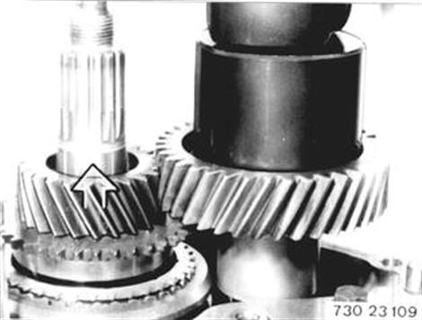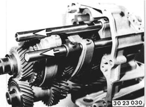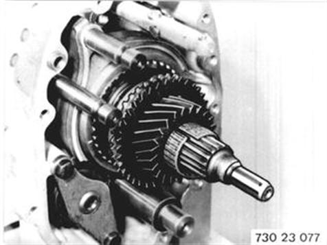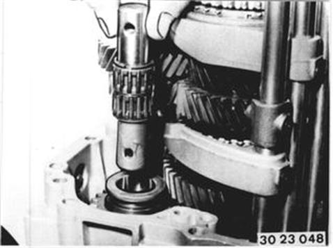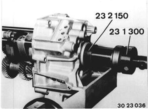REMOVING AND INSTALLING INPUT AND OUTPUT SHAFTS Revmove transmission case front section 23 11 010. Remove transmission case rear section 23 11 022. Swing output shaft down. Pull 5th gear off of layshaft with Special Tool 23 0 080. Bearing inner race is also pulled off. Pressing off force 9 ... 10 t. 23 11 010 23 11 022