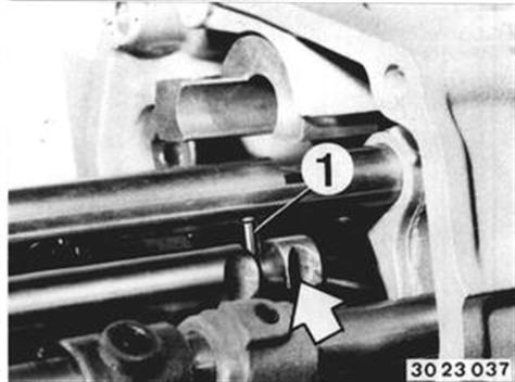 Move selector rods to neutral position. Slide 3rd/4th gear selector rod through selector forks. Install lockpin (1) in selector rod with grease. Push in selector rod up to bore. Opening in selector rod faces up. | ![]() |