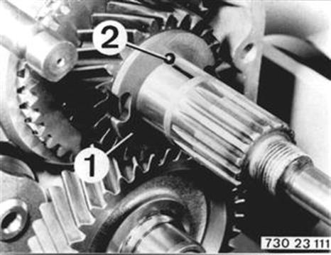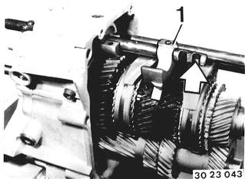 Only for Version with Reverse Gear Synchronization: Important: Position sliding sleeve that locking lever (1) aligns with groove (2) in sliding sleeve. | ![]() |