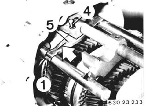 Install guide sleeve. Centering pin (5) faces 5th gear. Install 5th/reverse gear selector fork. Insert locking ball. Push in selector rod against spring. Insert detent ball and push down. Push in and turn selector rod that openings (1 and 2) are always opposite the detent ball. | ![]() |