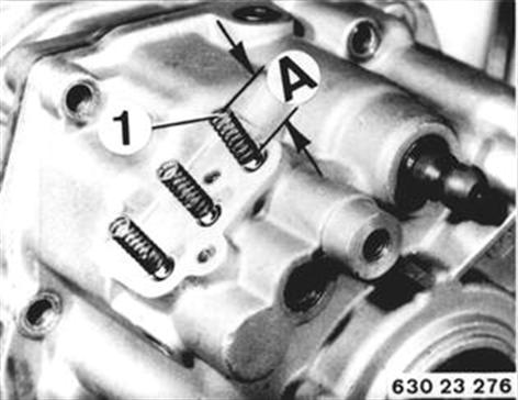 Install 3 locking balls and 3 springs. Important! Version with Different Length Springs: Install the shorter spring (1) with a relaxed length (A) of 15.9 mm (0.626´´) for the 5th/ reverse gear selector rod. | ![]() |