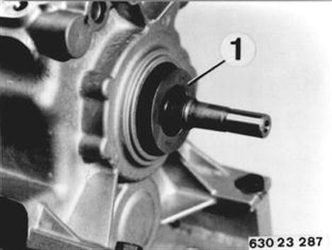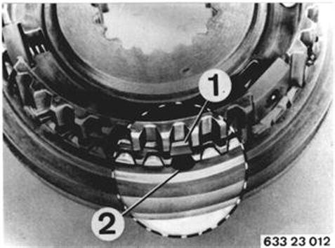 Installation: Heat ball bearing inner race to about 80°C (176°F) and push on output shaft. Important: Turning lock! Opening in bearing inner race must engage in ball. Draw reference line (1) to facilitate installation of bearing inner race. | ![]() |