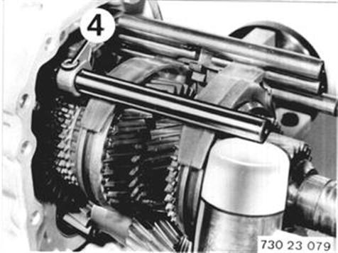 Assemble synchronizer. Springs (2), thrust pads (3) and balls (4). Insert all springs, thrust pads and balls. Curved surfaces of thrust pads (3) face operating sleeve. Push in balls far enough that guide sleeve can move into sliding sleeve. | ![]() |