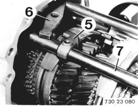 Pull off or remove turning lock (5) and operating lever (6). Pull out selector rail (7) forward. Remove 2nd gear again. | ![]() |