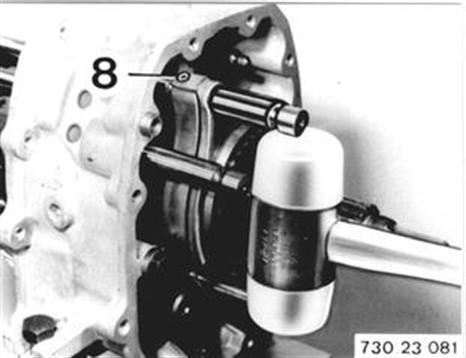 Pull out 5th gear selector rod with selector fork and operating sleeve toward rear far enough that lockpin (8) can be knocked out, while holding tight. Important: Loose balls, springs and slides. Installation: Replace lockpin. | ![]() |