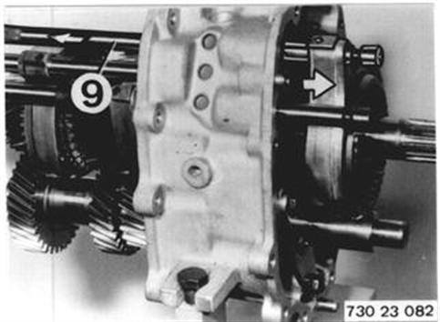 Pull off operating sleeve and 5th gear selector fork. Pull out selector rod (9) forward. Important: Loose balls. | ![]() |