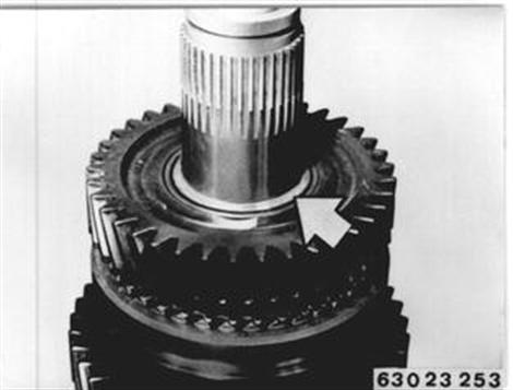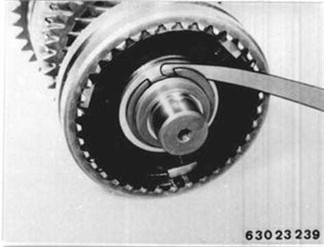 Assembling: Note: Check synchromesh rings for wear (see 23 23 505) prior to assembling. Install needle bearing, reverse gear and synchromesh ring. Install guide and operating sleeves on splines of output shaft. Transmission 260/6 and 260/5**: Stepped end of sliding sleeve faces reverse gear or, in case of version with 1 groove, 5th gear. 23 23 505 ** Since 5.85