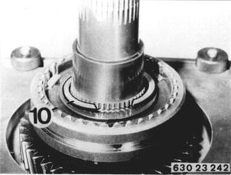 Install needle bearing, synchromesh ring and 2nd gear wheel. Important! The collar for the bearing sleeve must protrude slightly on the output shaft. If applicable, check seating of circlip (10). | ![]() |