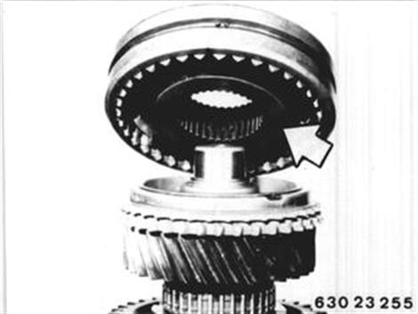 Press 2nd gear, needle bearing, synchromesh ring, guide sleeve, synchromesh ring, 1st gear, needle bearing with bearing bushing and bearing inner race off of output shaft. Check condition of all needle bearings, replacing if necessary. Check synchromesh rings (see 23 23 505). 23 23 505