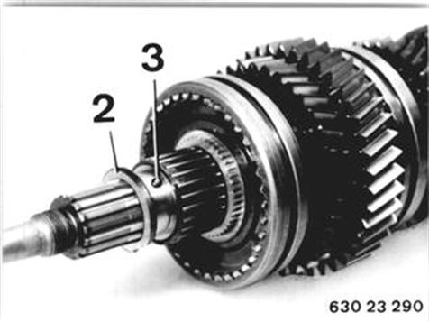 REPLACING OUTPUT SHAFT - OUTPUT SHAFT REMOVED - Pull off input shaft (1), synchromesh ring (2) and needle bearing (3). | ![]() |