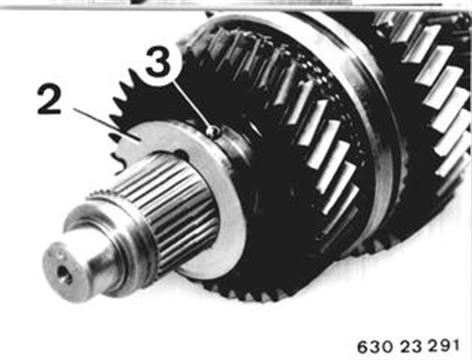 Transmission 260/6: Slide needle bearing on to output shaft. Install ball (3). Install thrust washer (2) with opening facing the ball. Install synchromesh ring and 5th gear wheel. | ![]() |