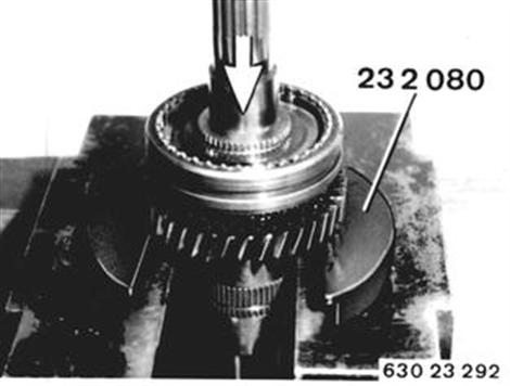 Press off guide sleeve, operating sleeve and reverse gear wheel with Special Tool 23 2 080, the bottom end of which faces the gear wheel. Take off needle bearing. Pressing-off force*. * See Specifications